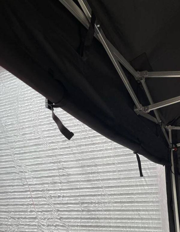 - Zijwanden worden met een doorlopende klittenbandstrook aan het dakzeil bevestigd